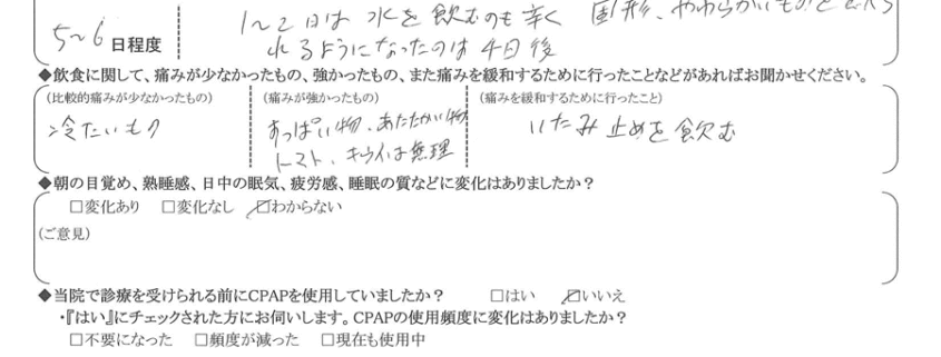 (痛みの程度について) 1~2日は水を飲むのも辛く、固形・柔らかい物を食べられるようになったには4日後。