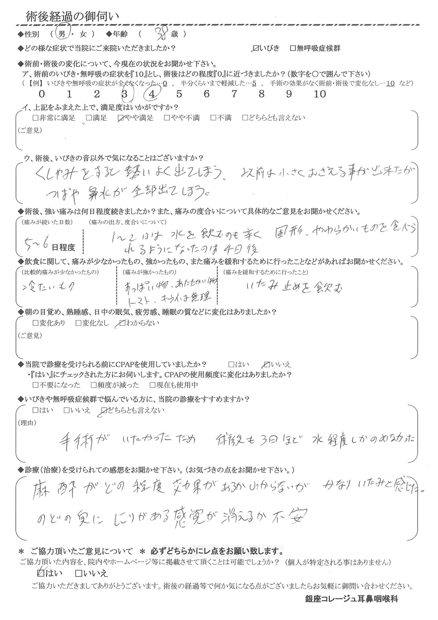 ア, 術前のいびき・無呼吸の症状を『10』だったとすると、術後はどの程度になりましたか? 【3~4】