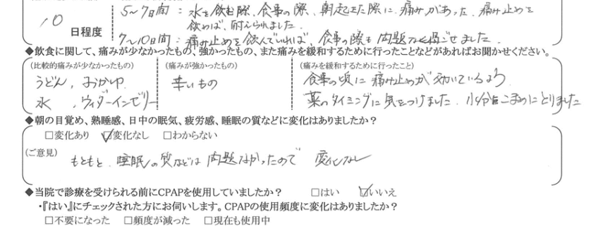 (痛みの程度について) 5~7日間:水を飲む際・食事の際・朝起きた際に、痛みがあった。痛み止めを飲めば耐えられました