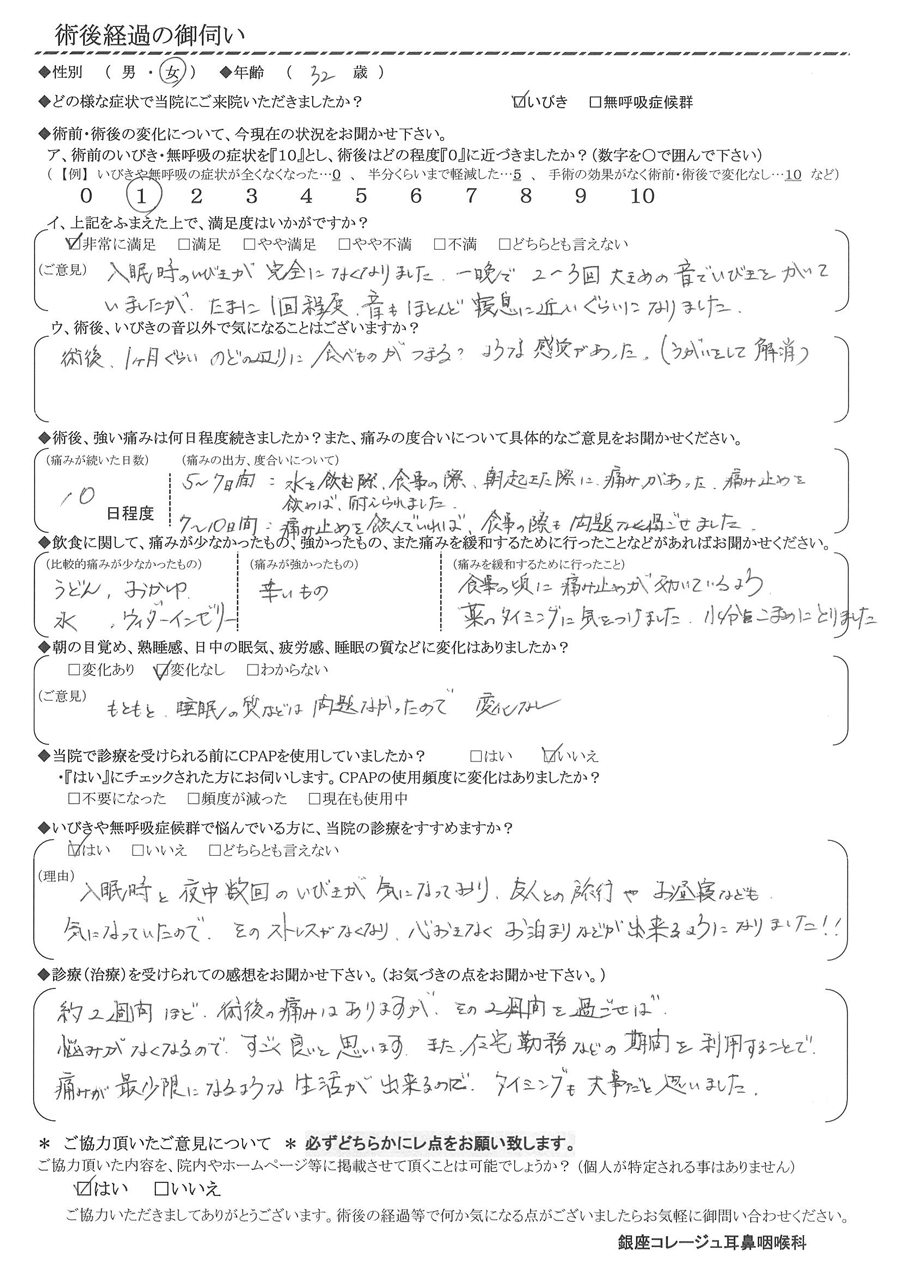 (理由) 入眠時と夜中数回のイビキが気になっており、友人との旅行やお昼寝なども気になっていたので、そのストレスが無くなり心置きなくお泊りなどができるようになりました!!
