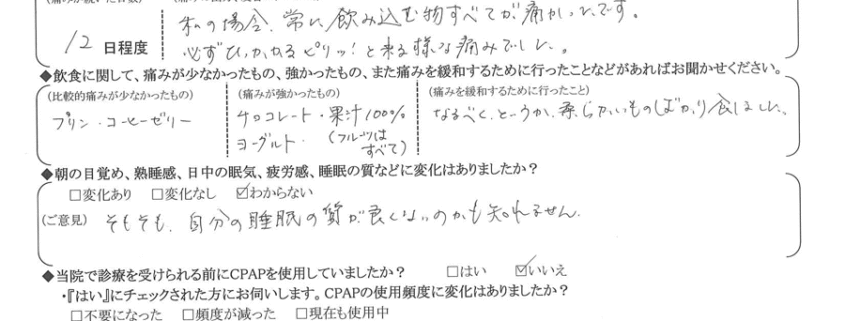 A:(痛みを緩和するために行ったこと) なるべくと言うか、柔らかい物ばかり食しました