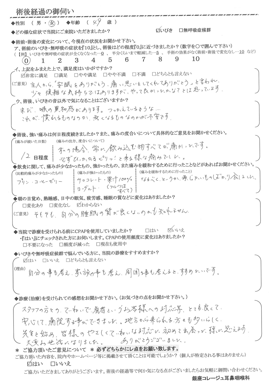 (ご意見) 主人から「安眠をありがとう。痛い思いをしてくれて、ありがとう」と言われ、少々複雑な気持ちではありますが、やって良かったかな?とは思っています。