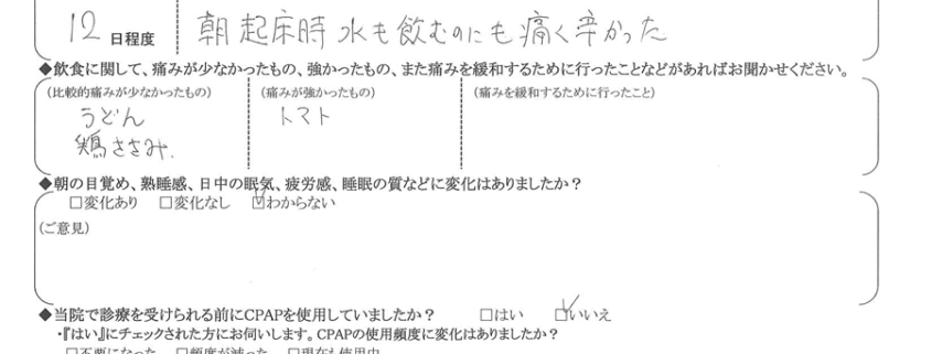 (痛みの程度について) 朝、起床時、水を飲むのにも痛く辛かった。