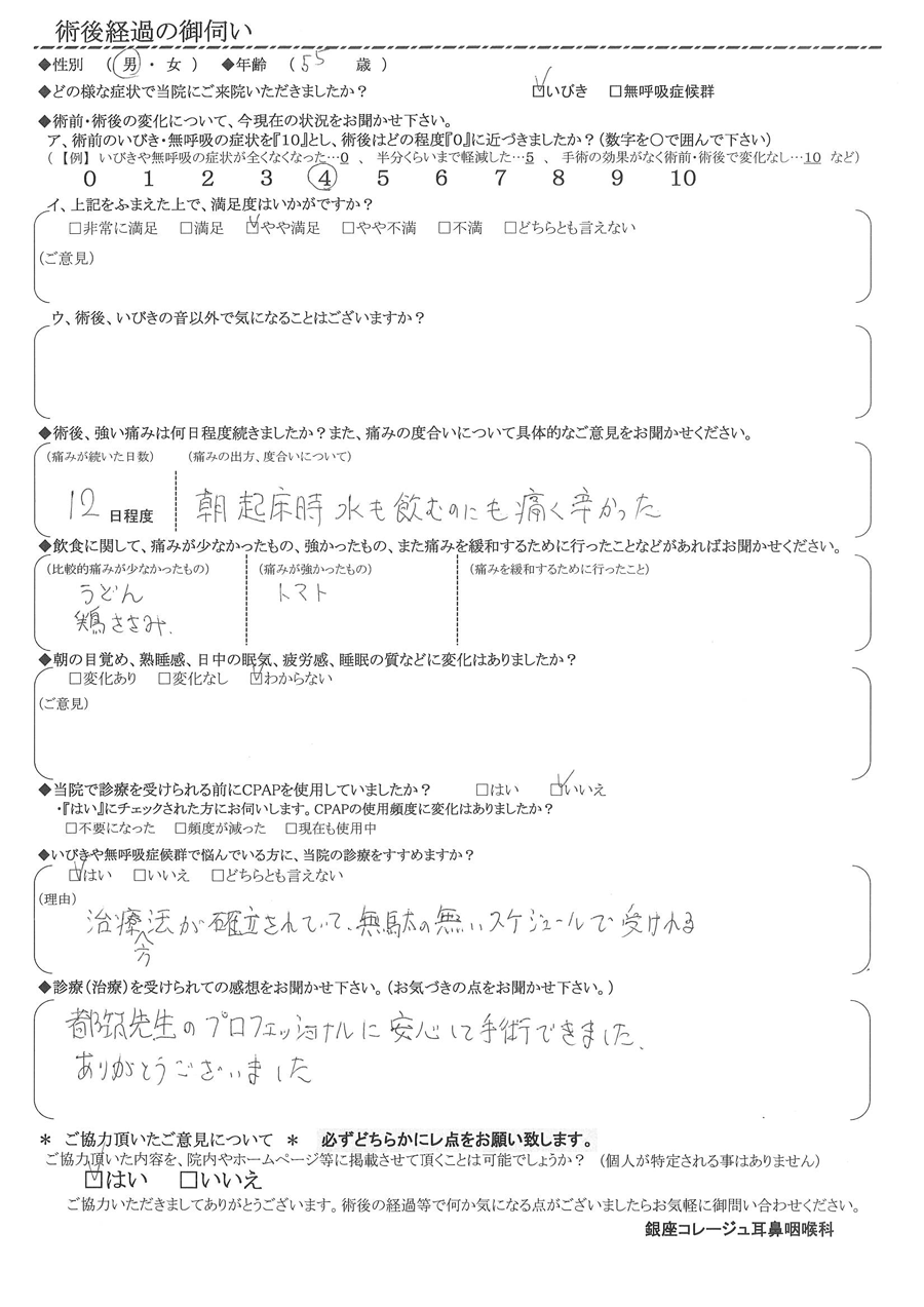 ア, 術前のいびき・無呼吸の症状を『10』だったとすると、術後はどの程度になりましたか? 【4】