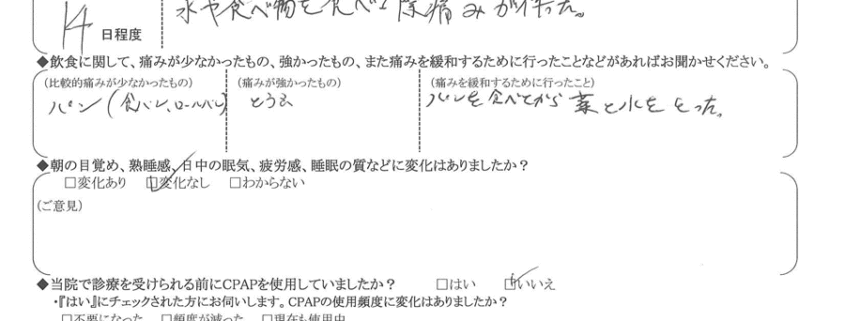 (痛みの程度について) 水や食べ物を食べる際、痛みが伴った。