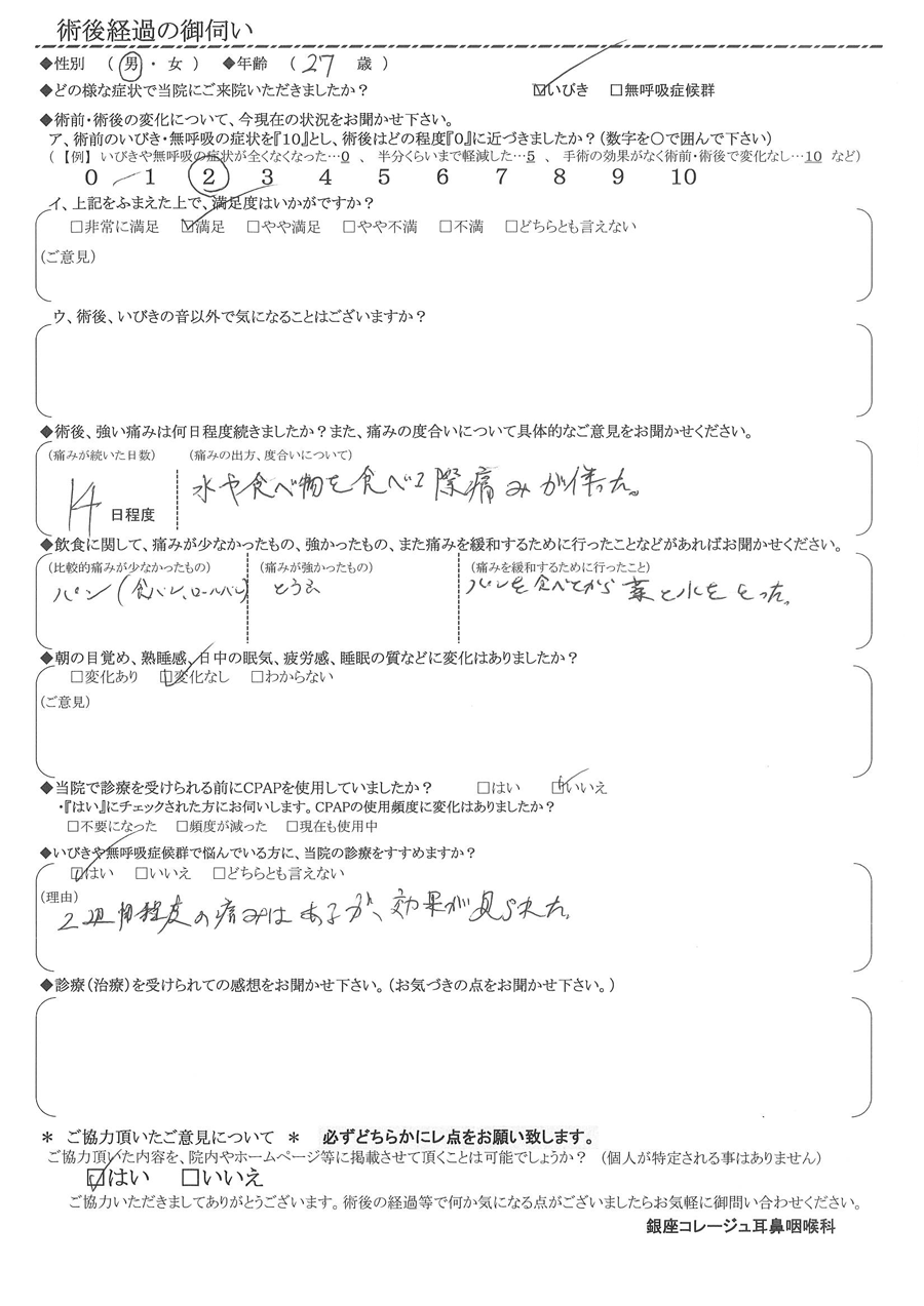 ア, 術前のいびき・無呼吸の症状を『10』だったとすると、術後はどの程度になりましたか? 【2】