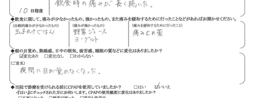 (痛みの程度について) 飲食時の痛みが長く続いた。