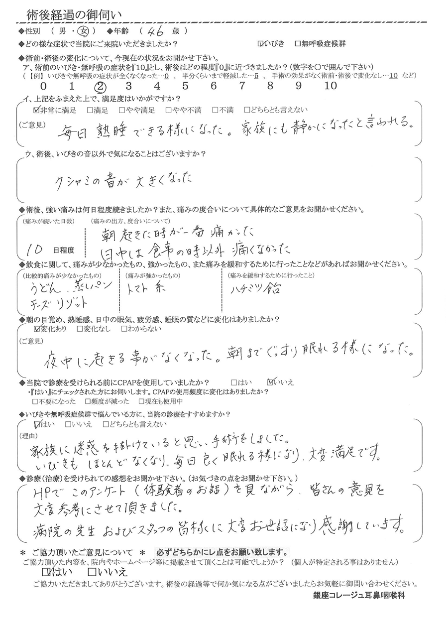(理由)  家族にも迷惑をかけていると思い、手術をしました。イビキもほとんど無くなり、毎日良く眠れる様になり、大変満足です。