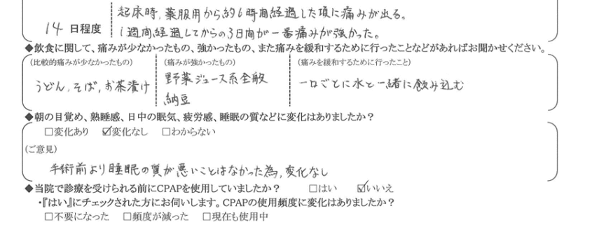 (痛みの程度について) 起床時、薬服用から約6時間経過した頃に痛みが出る。1週間経過してからの3日間が、一番痛みが強かった。