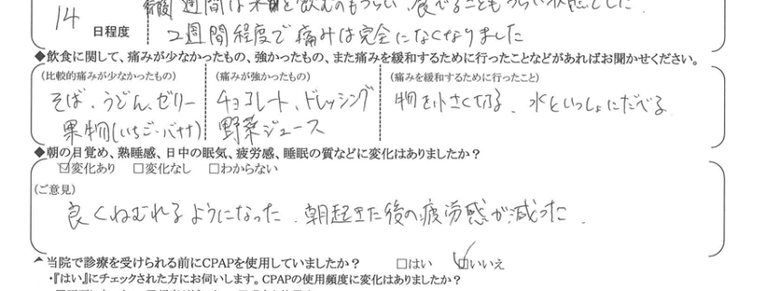 A:(痛みを緩和するために行ったこと) 物を小さく切る・水と一緒に食べる