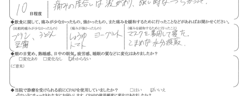 (痛みの程度について)  痛みの度合いは波があり、強い時は辛かった。