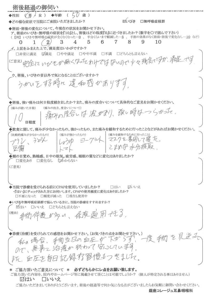 (ご意見)  完全にイビキが無くなったわけではないので、少々残念ですが、満足です。
