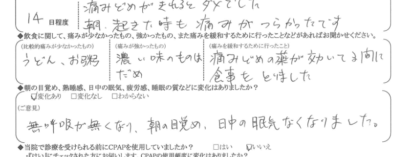 (ご意見) 無呼吸が無くなり、朝の目覚め・日中の眠気なくなりました。