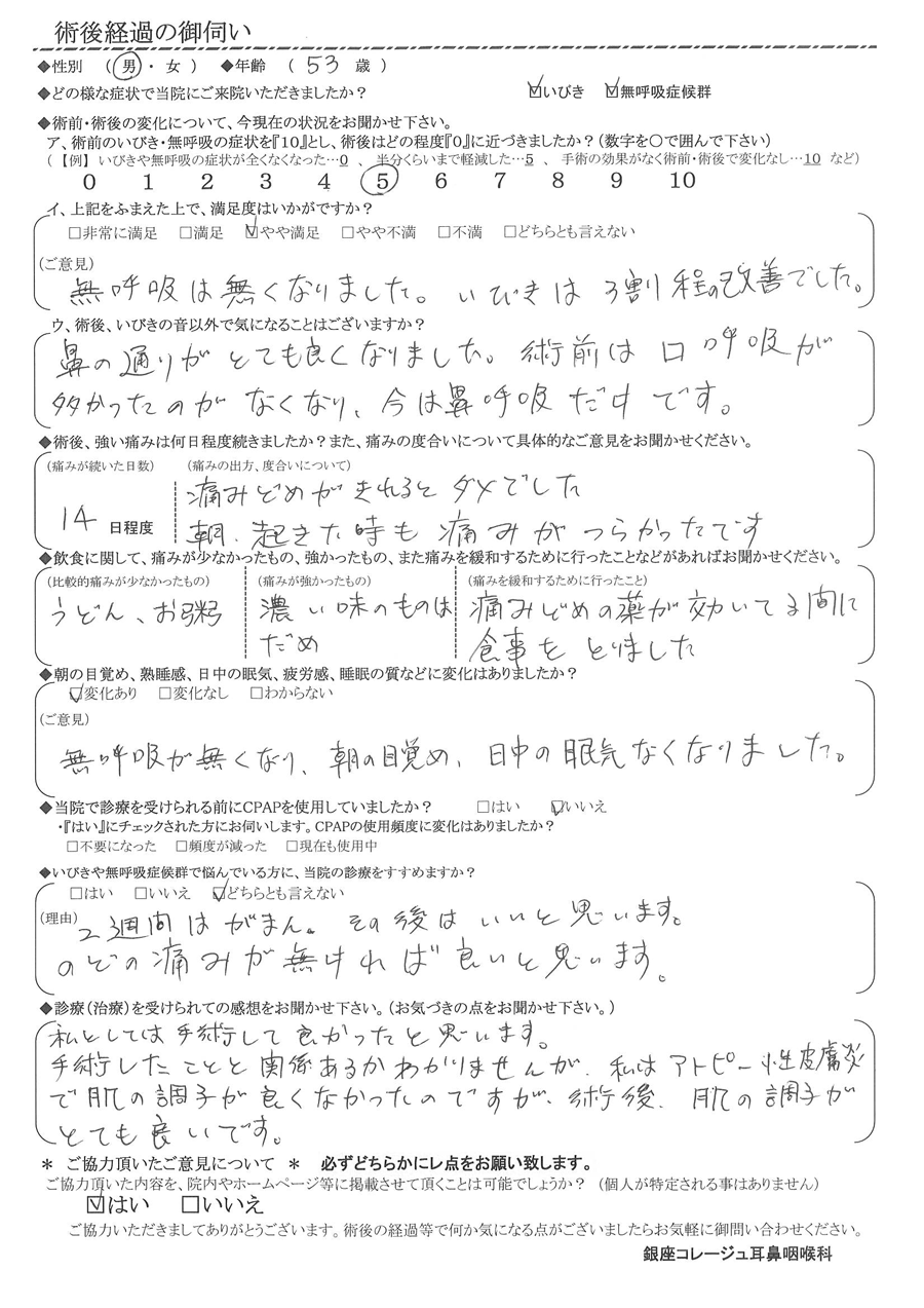 ア, 術前のいびき・無呼吸の症状を『10』だったとすると、術後はどの程度になりましたか? 【5】