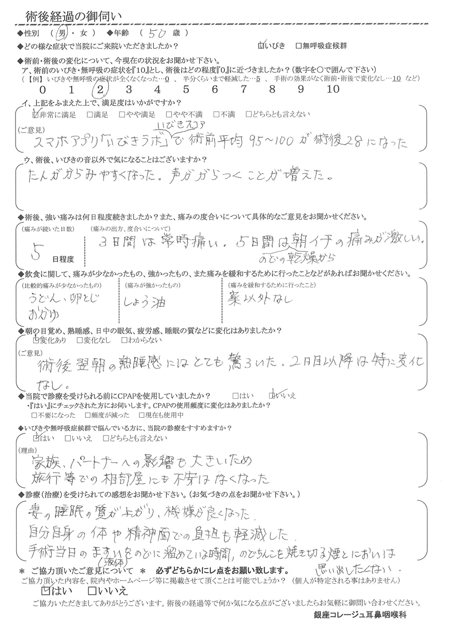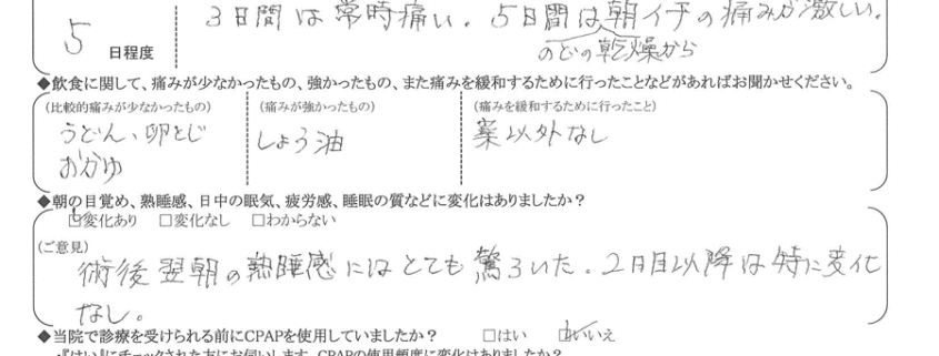 (ご意見) 術後、翌朝の熟睡感にはても驚いた。2日目以降は特に変化なし。