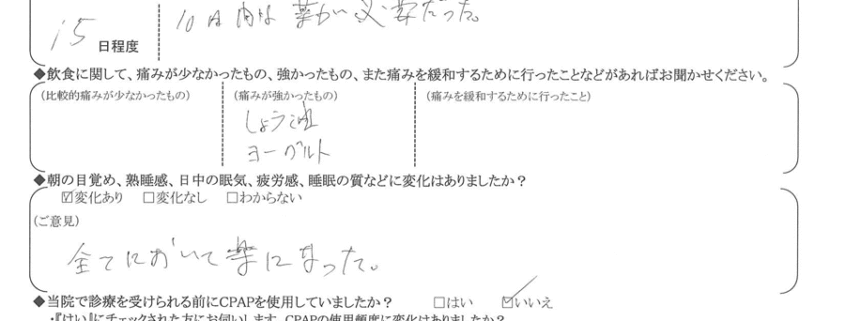 Q.術後、強い痛みは何日程度続きましたか?また、痛みの度合いについて具体的なご意見をお聞かせください。