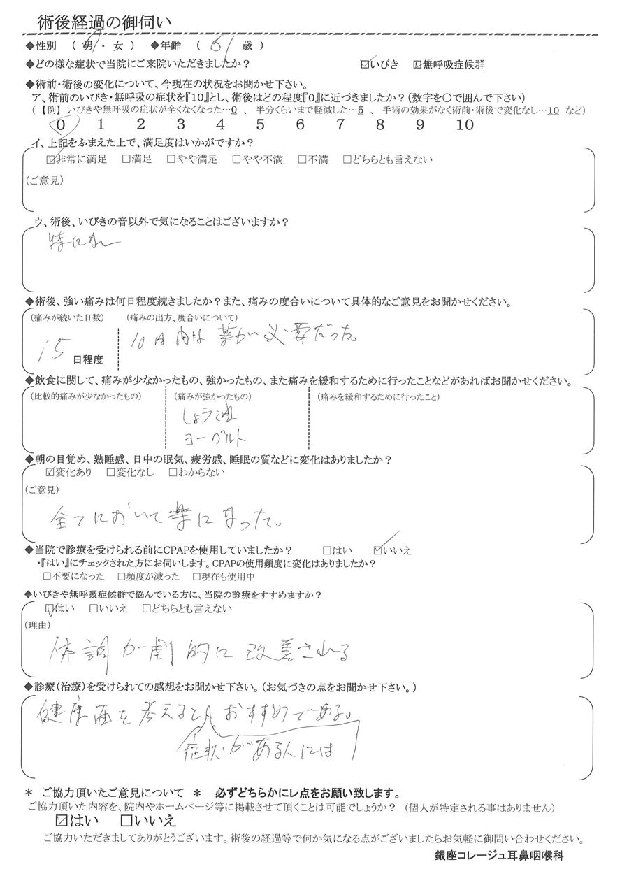 ア, 術前のいびき・無呼吸の症状を『10』だったとすると、術後はどの程度になりましたか? 【0】