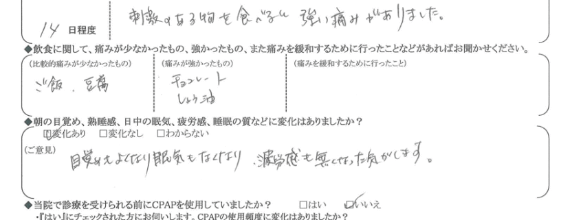 (痛みの程度について) 刺激ある物を食べると、強い痛みがありました。