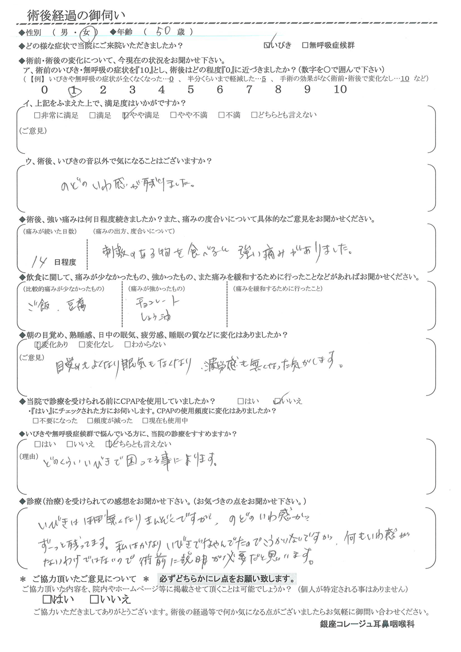 A: イビキはほぼ無くなり、満足です。喉の違和感がずーっと残っています。私はかなりイビキで悩んだので、後悔無いですが、何も違和感が無いわけではないので術前に説明が必要だと思います。