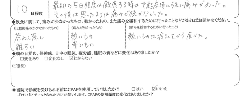 (痛みの程度について) 最初の5日程度は、飲食する時や起床時に強い痛みがあった。その後は、思ったよりは痛みが続かなかった。