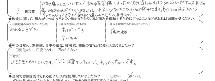 A: OPEするまでは恐怖でいっぱいでしたが、終わってしまえばこんなものか…程度の痛みでした。内服でコントロールできたので座薬は使ってないです。術中は「歌をうたうようにして…」とのどを開く指示がありましたがどうやるかわからないので始まる前に練習したかったです。