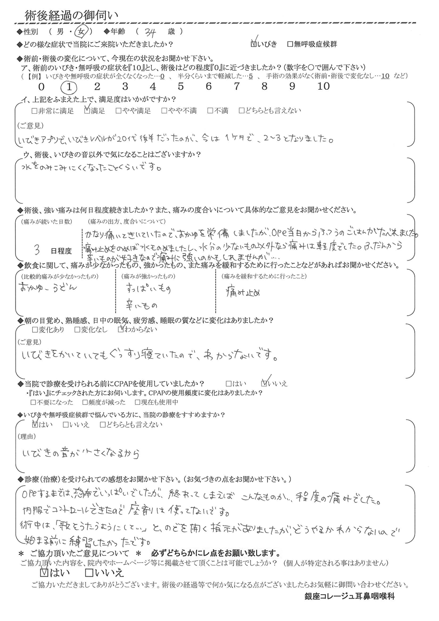ア, 術前のいびき・無呼吸の症状を『10』だったとすると、術後はどの程度になりましたか? 【1】