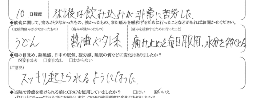 (痛みの程度について)  術後は飲み込みが非常に苦労した