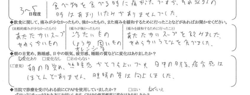 (ご意見) 術前は日中の眠気がひどく仕事に大きな支障がありましたが、術後は日中眠くなく、仕事が順調です。