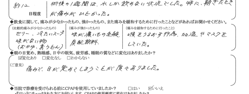 (痛みの程度について) 術後の1週間は水しか飲めない状況でした。特に、朝おきたときが痛みがひどかった。