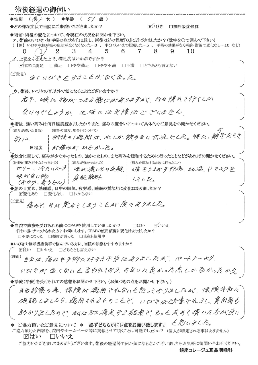 (理由) 自分は痛みや手術に対する不安はありましたが、パートナーよりいびきが全くないと言われており、お互いに良かった点しかなかったから。