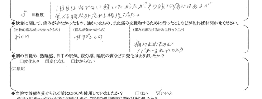 (痛みの程度について) 1日目はねれない程いたかったが、その後は痛みはあるが食べる時以外忘れる程度だった。