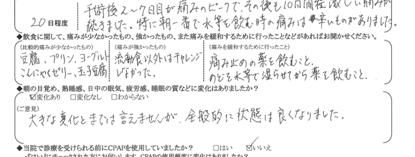 (痛みの程度について) 手術後2~7日目が痛みのピークで、その後も10日間程激しい痛みが続きました。特に朝一番で水等を飲む時の痛みは辛いものがありました。