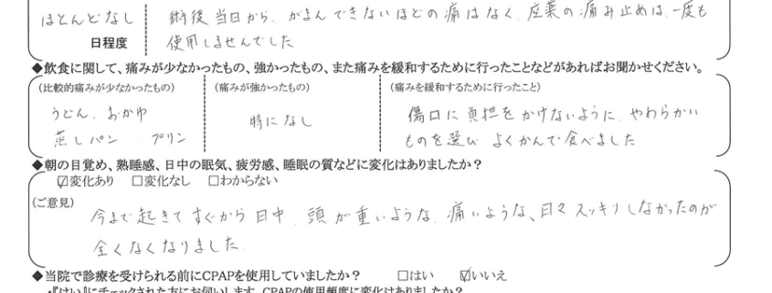 A: 長い間、睡眠がしっかりとれず寝ても寝ても毎日がだるく日中頭が重く、ひどいと夜中に呼吸が止まって目が覚めることもあり、本当に辛かったのがすっかりなくなりこんなに日々、元気に過ごせるならもっと早く手術すれば良かったと思っています。先生方には本当に感謝の気持ちでいっぱいです。ありがとうございました。