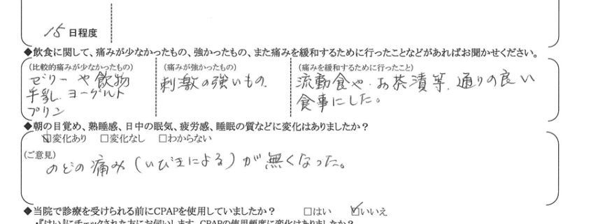 A: いびきによるのどの痛みはなくなったが、常に骨がひっかかっている様な痛みと違和感が思ったより酷くちょっとつらいです。