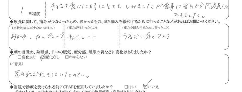 (痛みの程度について) チョコを食べた時はとてもしみましたが食事は当日から問題なくできました。