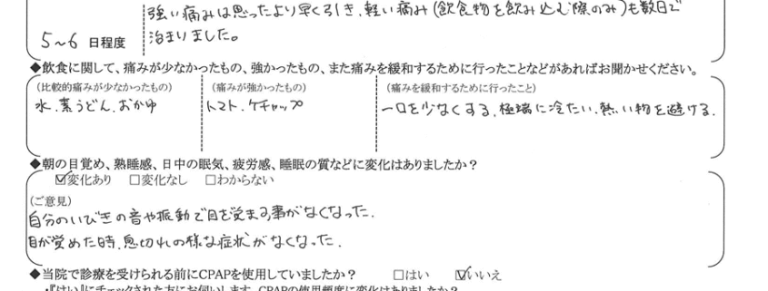 (ご意見) 自分のいびきの音や振動で目を覚ます事がなくなった。目が覚めた時、息切れの様な症状がなくなった。