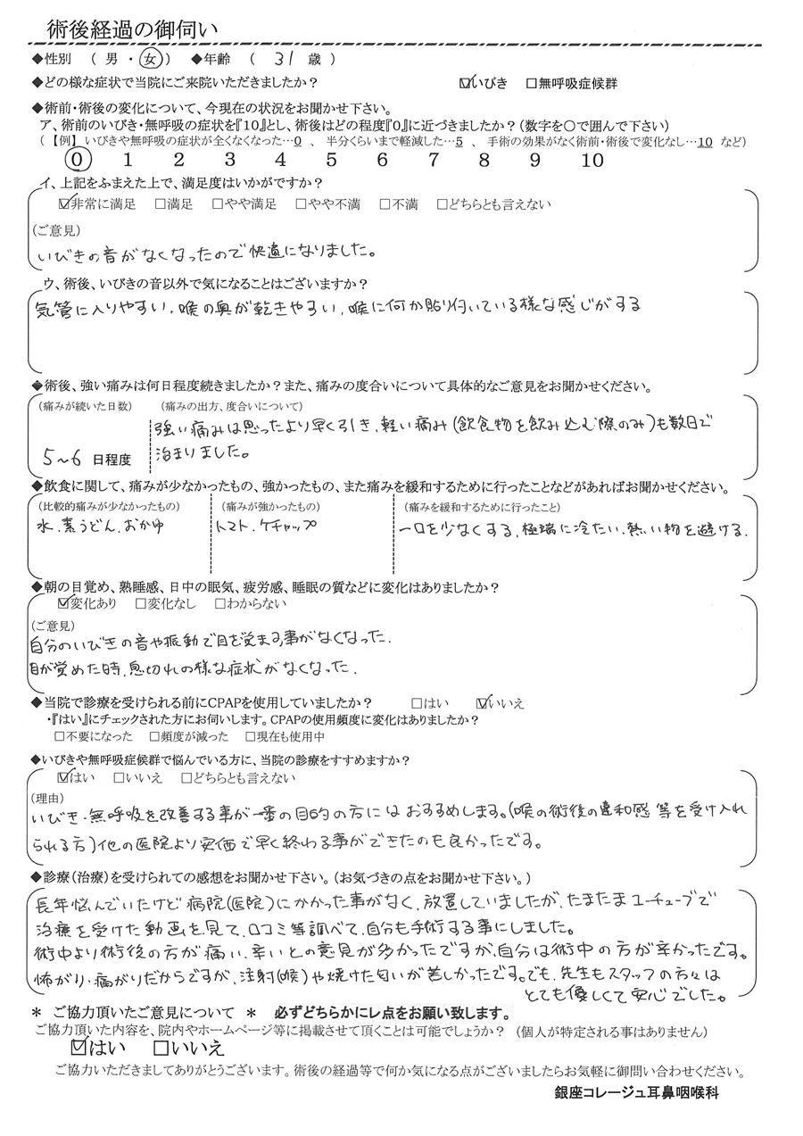 (理由) いびき・無呼吸を改善する事が一番の目的の方にはおすすめします(喉の術後の違和感等を受け入れられる方)。他の医院より安価で早く終わることができたのも良かったです。