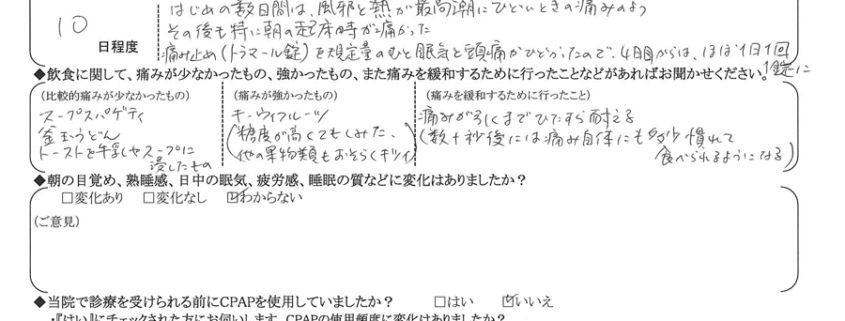 Q.術後、強い痛みは何日程度続きましたか?また、痛みの度合いについて具体的なご意見をお聞かせください。