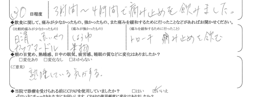 (痛みの程度について) 3時間~4時間で痛み止めを飲みました。
