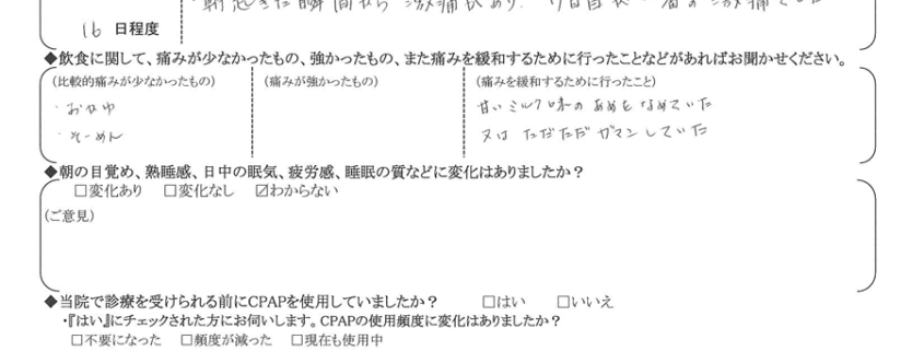 A:(痛みを緩和するために行ったこと) 甘いミルク味のあめをなめていた。又はただただガマンしていた