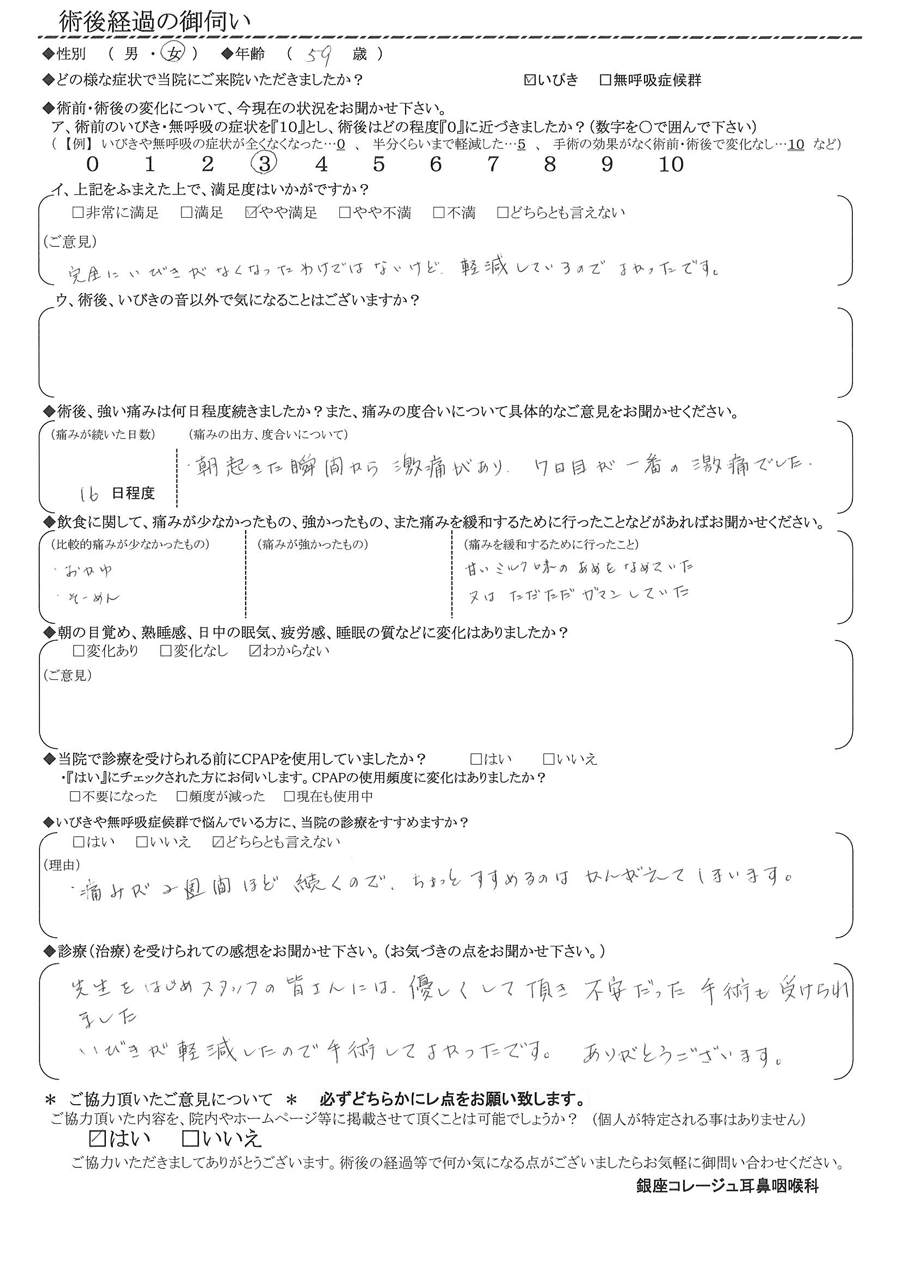 A: 先生をはじめスタッフの皆さんには優しくて頂き不安だった手術も受けられました。いびきが軽減したので手術してよかったです。ありがとうございます。