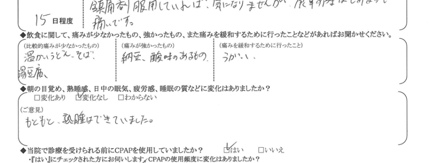 (ご意見) いびきは相当軽減しているようです。無呼吸はCPAP治療継続しています。