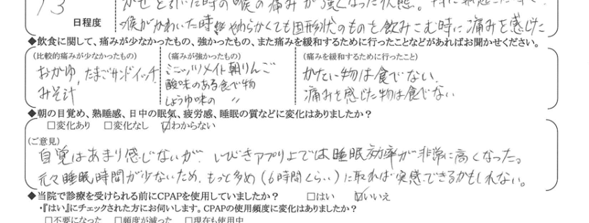 A: 手術を受けて本当に良かったです。ありがとうございました。以前はたんの絡みにもなやまされていましたが、術後はほとんどたんの絡みが無くなり、いびき以外の効果もありました。少しでもなやんでいる全ての人におすすめしたいです。