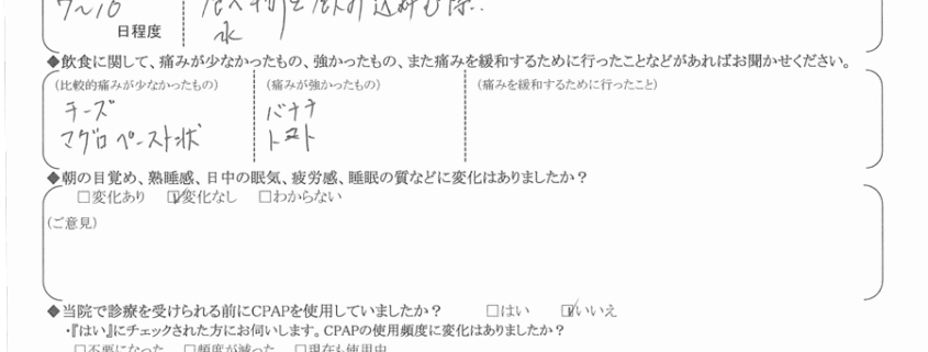 A: 術前には、いびきの改善状況と、痛みの不安がありましたが、結果は、いびきは改善され、強い痛みがありましたが、全体として治療して良かったです。