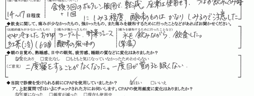 A: (痛みの程度について) 食後3回+1回のボルタレン服用で軽減。座薬は使用せず、つばの飲み込み時にしみる程度。
