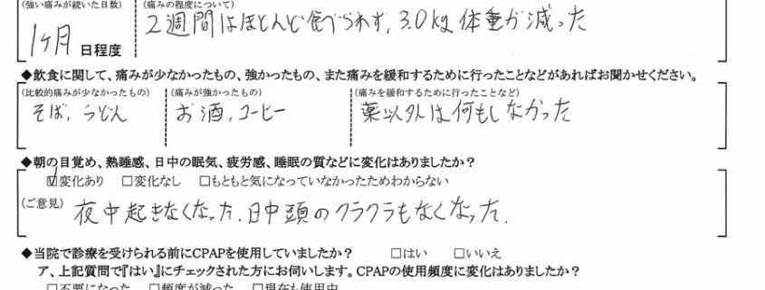 A:(痛みの程度について) 2週間はほとんど食べられず、3.0㎏体重が減った。