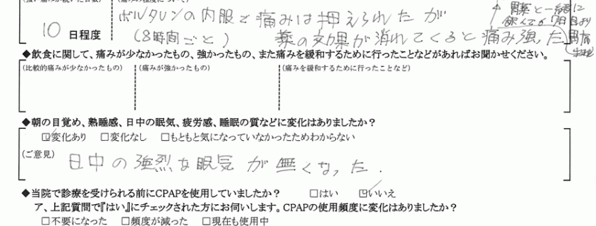 A:(痛みの程度について) ボルタレンの内服で痛みは押さえられたが、薬の効果が消えてくる痛み強った。