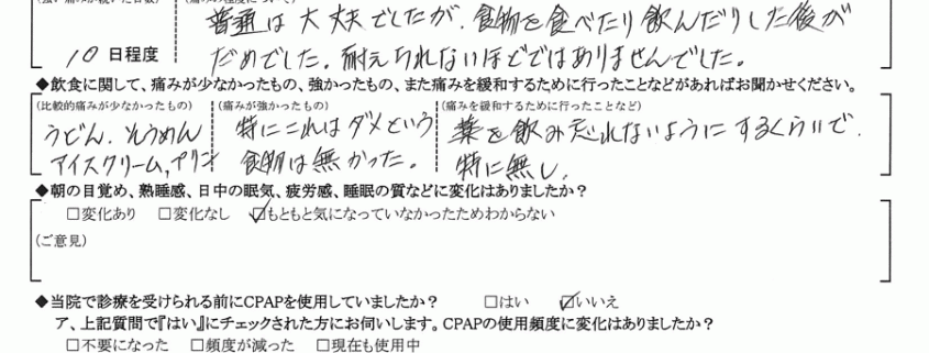 A:(痛みの程度について) 普通は大丈夫でしたが、食物を食べたりのんだりした後がだめでした。