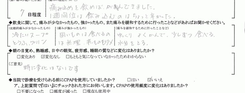 A:(痛みの程度について) 痛み止めを飲めばがまんできました。1週間位は飲み込むのはちょっと辛かった。