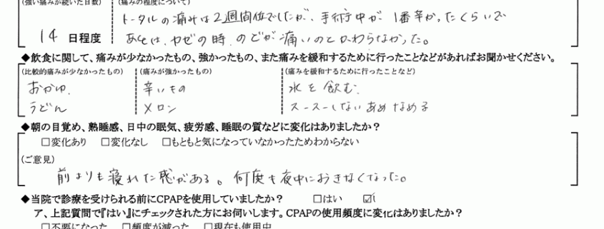 A:(痛みの程度について) トータルの痛みは2週間位でしたが、手術中が1番辛かったくらいで、あとはカゼの時、のどが痛いのとかわらなかった。